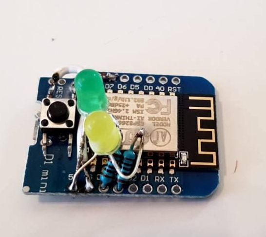 Nicht schön, aber so sah der erste Pingbot aus. Inzwischen benötige ich weder die LED´s, noch den Taster und habe nur einen ESP ein dem Case.