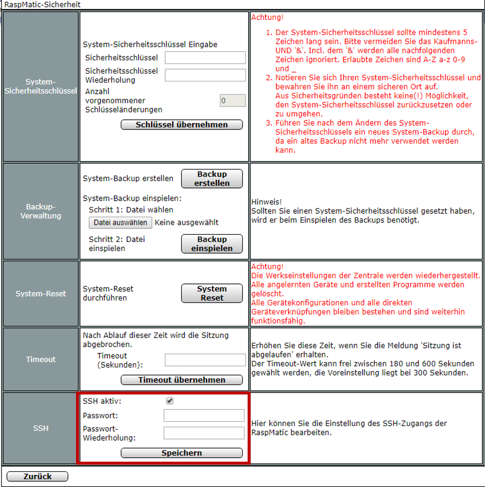 Unter Einstellungen –> Sicherheit befindet sich ganz unten der Punkt „SSH“. Hier muss der Haken gesetzt und ein Passwort vergeben werden.
