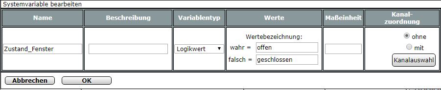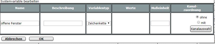 Zuerst muss eine Systemvariable angelegt werden. In meinem Beispiel habe ich sie „Zustand_Fenster“ genannt.