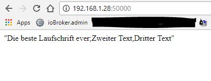 Auf der Konfigurationseite des Matrix Displays muss eine URL eingeben werden. Die URL ruft den Browser auf und darf nur Text ausgeben, der in Anführungsstrichen umschlossen ist, z.b. so "Die beste Laufschrift ever;Zweiter Text,Dritter Text"
