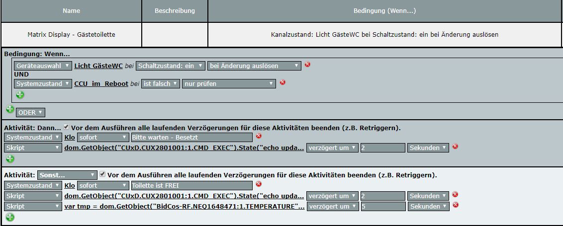 Der Inhalt wird dann im Programm eingetragen. In meinem Fall löst die Lampe auf der Gästetoilette das Programm aus und setzt dann die Variable auf „Bitte warten Besetzt“. Im „Sonst“ Bereich schreibe ich in die Variable „Toilette ist FREI“.