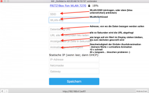 Testaufbau steht, WLAN verbindet, Sketch ist fehlerfrei hochgeladen. Habe eine leere Index.html mit entsprechendem „Hallo“ angelegt und auf einen Webserver hochgeladen, Im Browser Quelltext kontrolliert, es kommt auch nur das „Hallo“ zurück. Flugs die URL im Modul eingegeben. Es zeigt nix an, die Segmente flackern rhythmisch 🙂 Dann leuchten wieder alle, dann flackerte wieder. Scheinbar will er irgendwas anzeigen, kann aber nicht „übersetzen“. Das gleiche passiert wenn ich eine String-Variable in der CCU anspreche. Haste da bitte noch einen Tip für mich?