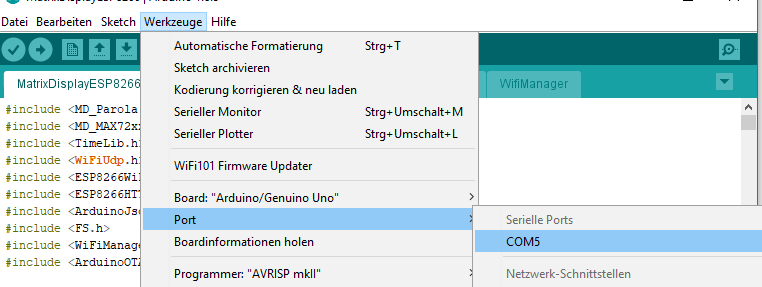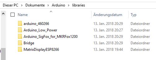 Nach der Installation holt man sich die *.ZIP Datei von Jerome und entpackt diese im Ordner „libraries“. Nach ein paar Anpassungen kann die *.ino Datei „MatrixDisplayESP8266.ino“ durch einen Doppelklick geöffnet werden. Um das zu erklären, habe ich eine kleine Galerie mit Erklärungen erstellt.