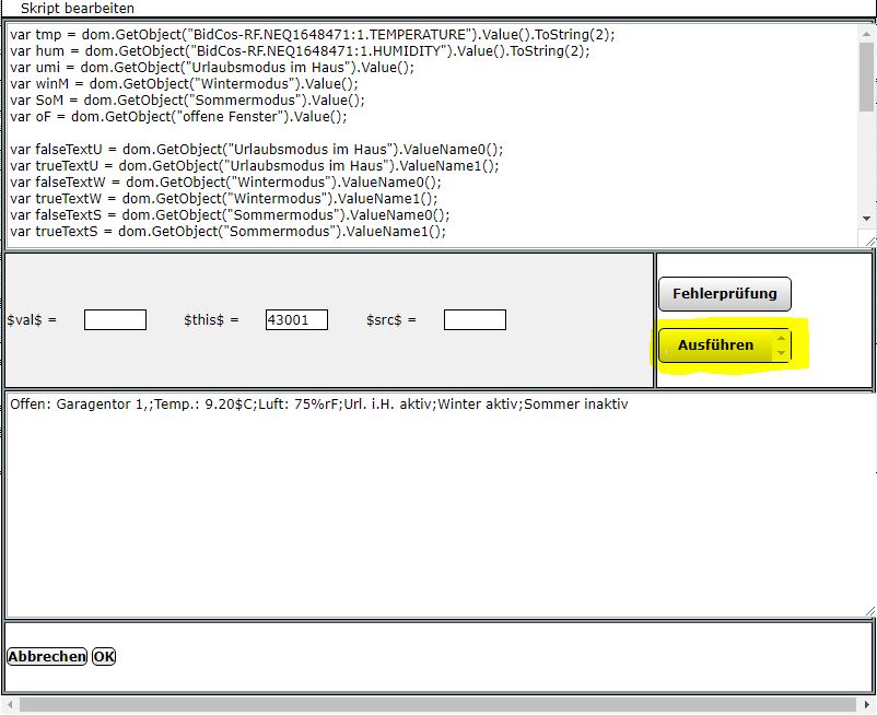 Mein Script sieht inzwischen folgendermaßen aus. Damit lasse ich mir die offenen Fenster und Türen, Temperatur, Luftfeuchte und die Modi für die Jahreszeit anzeigen. Für den Anfang genügen ja auch zwei Kanäle.