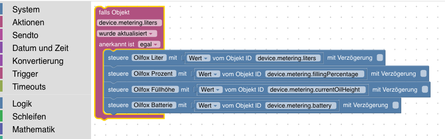 Nachdem der Adapter in iobroker installiert wurde (und vorher natürlich auch die Homematic Adapter), muss zuerst ein Script in ioBroker angelegt werden, damit die Daten des Oilfox in zuvor erstellte Variablen der CCU geschrieben werden können. Anschließend können die gefüllten Variablen für weitere Aktionen in Programmen verwendet werden.