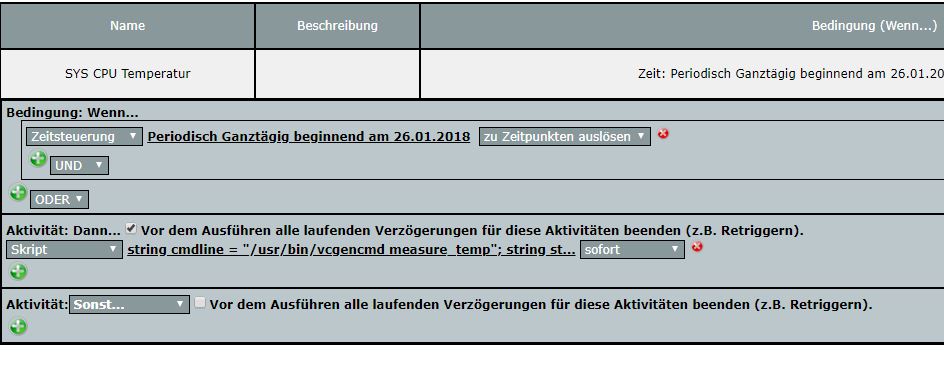 Und wieder gibt es Neuigkeiten von Jerome. Mit folgendem Code ist es möglich, die Prozessortemperatur des Raspberry abzufragen und als Systemvariable in die WebUI zu übernehmen.