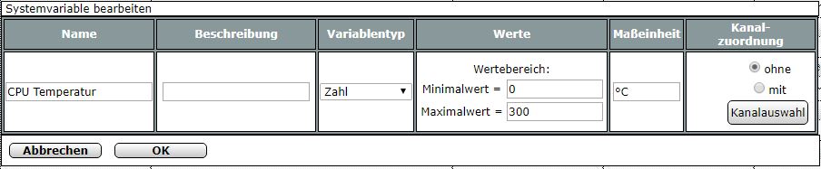 Zuerst muss eine Systemvariable vom Typ „Zahl“ mit der Einheit „° C“ angelegt werden.