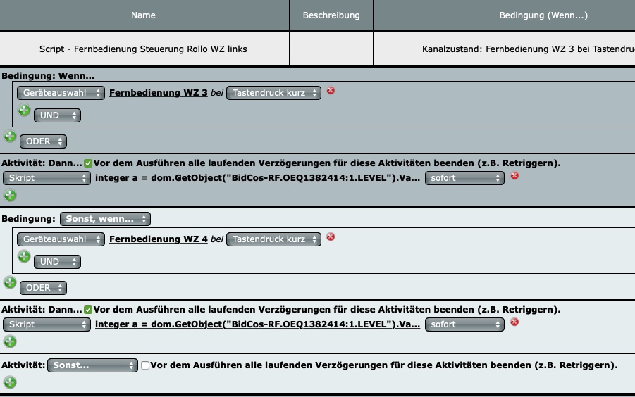 Hier das Programm dazu, indem ich den Rollo (Homematic) mit meiner HmIP Fernbedienung mit jedem kurzen Tastendruck um 25% rauf-, bzw. herunterfahre.