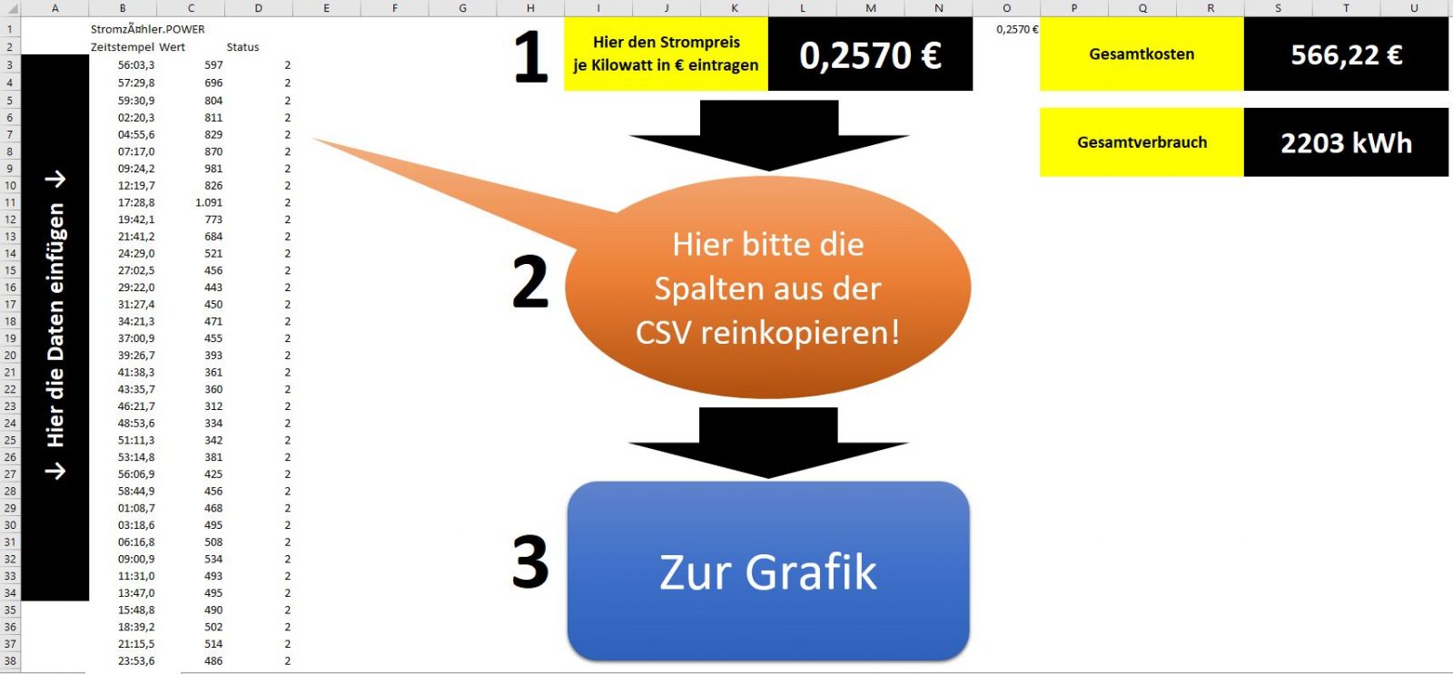 Diese 3 Spalten müssen dann in meiner Vorlage, in Spalte B + C + D eingefügt werden. Hierzu genügt es, die Spalte „B“ anzuklicken und die Dateien aus dem Zwischenspeicher mit „STRG“ + „V“ einzufügen. Abschließend fügst du noch deinen Strompreis in € ein.
